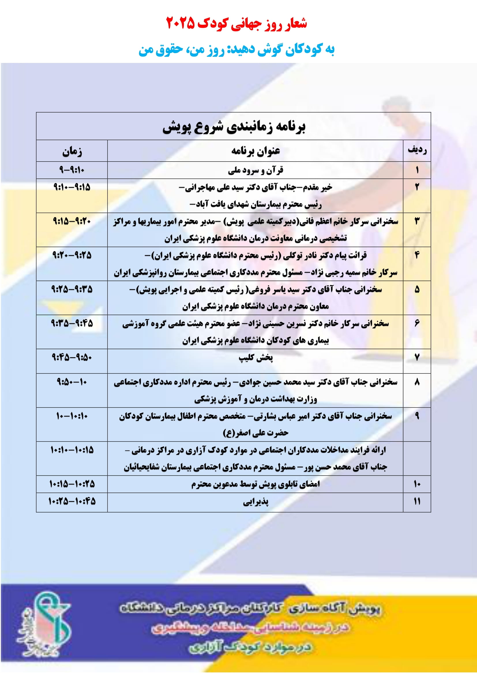 پیام رئیس دانشگاه علوم پزشکی ایران به مناسبت آغاز پویش پیشگیری از کودکآزاری به شرح زیر است:
